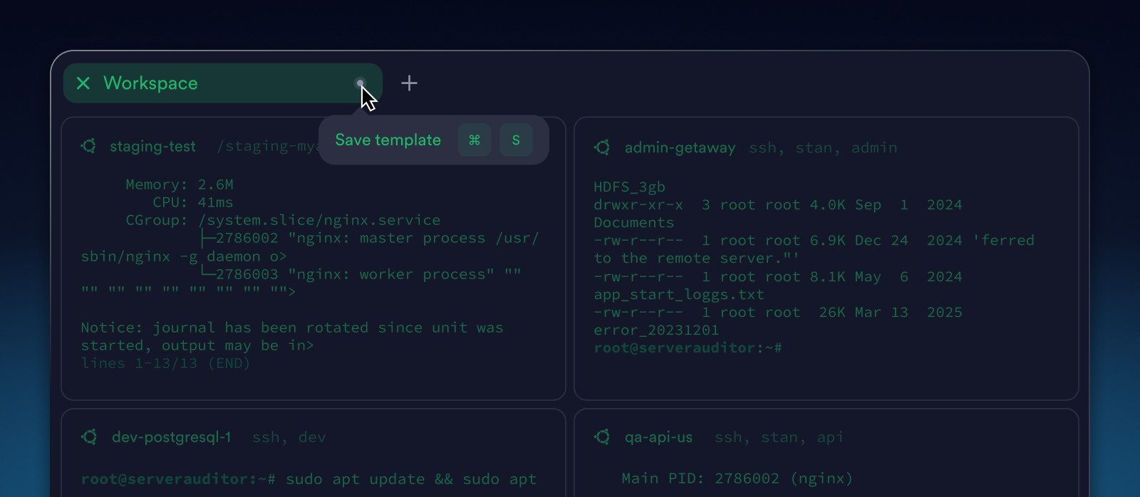 Instead of treating each connection as an isolated tab, Workspaces let you organize terminals by intent: a deployment, an incident, a feature rollout, or an investigation.